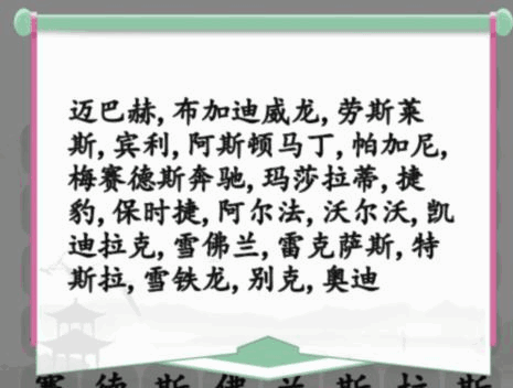 1、【汉字找茬王】找出汽车品牌,分别有:
