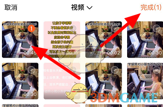 - 同意授权相册照片,选择视频,点击右上角完成。