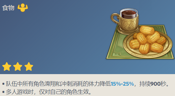 队伍中所有角色滑翔和冲刺消耗的体力降低15%-25%,持续900秒。
