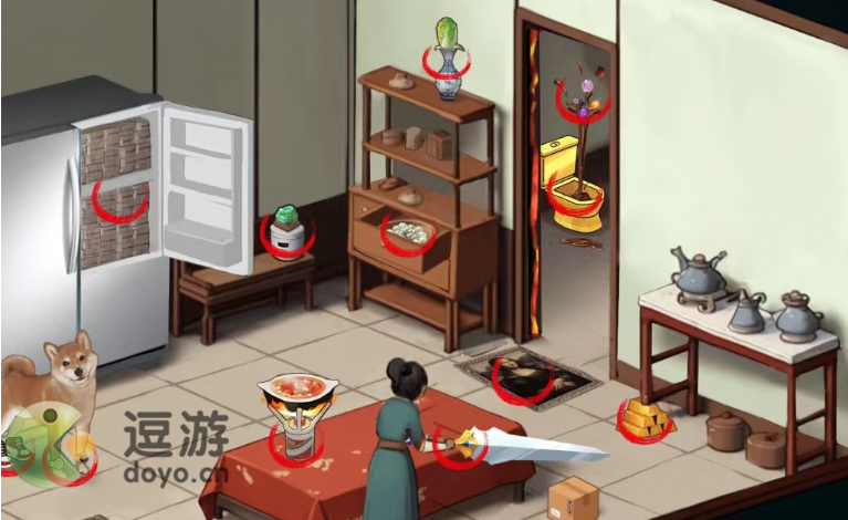 2、打开(kai)冰箱可(ke)以(yi)找(zhao)到冰箱藏钱,狗狗脚上穿着狗狗A锥和狗瑞士表,桌上是毛台灶打火锅,女人在用大宝剑拆箱,桌角是黄金(gold)